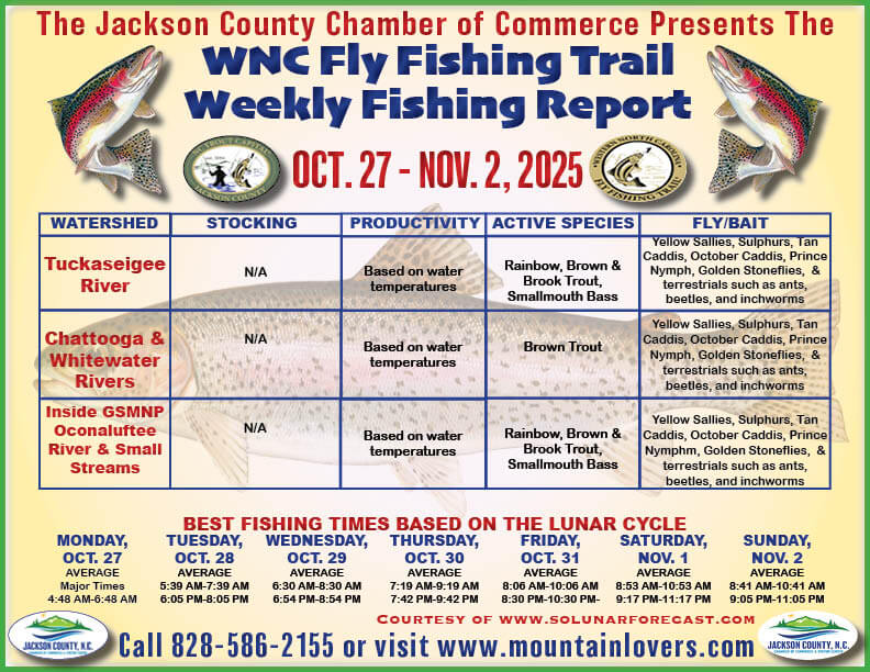 The centerpiece of the trail, and of Jackson County fishing in general, is the Tuckaseigee River. It is the county’s largest body of water, flowing some 40 miles from southeast to northwest. It has been referred to as “Western North Carolina’s best trout stream for fly anglers,” by The Charlotte Observer.